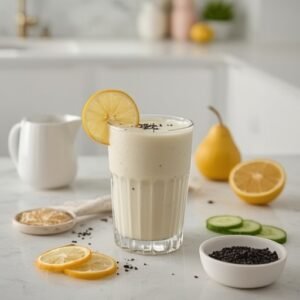 The Collagen Moonlit Yuzu-Black Sesame Smoothie is a refreshing change from standard berry-and-banana blends. It’s creamy but clean, citrusy but grounded, and just adventurous enough to feel like something you’d order at a boutique juice bar—yet easy to make at home in minutes. With hydrating cucumber, crisp daikon, naturally sweet pear, bold black sesame, and collagen peptides stirred into the mix, this is a smoothie you can reach for when you want both flavor and function.