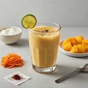 If your morning routine needs something brighter than plain yogurt or a basic fruit smoothie, this Saffron Citrus Lassi Smoothie delivers a refreshing upgrade. Inspired by the creamy, lightly spiced flavor profile of a classic lassi, this version uses kefir for a tangy probiotic base, tropical mango for natural sweetness, and orange for a citrusy lift. A small handful of grated carrot adds gentle earthiness and extra nutrients, while fragrant cardamom and delicate saffron threads turn an everyday smoothie into a café-worthy treat. The result is silky, sunny, and satisfying—perfect for breakfast, a post-workout sip, or an afternoon pick-me-up.