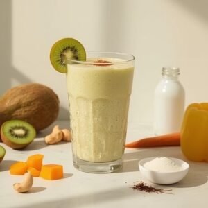 Glowing skin starts with what you sip—especially when your smoothie is built from hydrating fruit, colorful vegetables, and beauty-boosting add-ins. This Skin Radiance Saffron-Kiwi Cashew Luster Smoothie is a bright, tropical blend that tastes like a sunshine-forward refresher while supporting your skin from the inside out. With coconut water as the light, electrolyte-rich base, kiwi and papaya for a naturally sweet zing, and a pinch of saffron threads for an elevated “luxe” finish, this smoothie is designed to help you look as vibrant as you feel. Ground chia adds satisfying texture and fiber, while collagen peptides offer an easy way to incorporate daily collagen support without changing flavor.